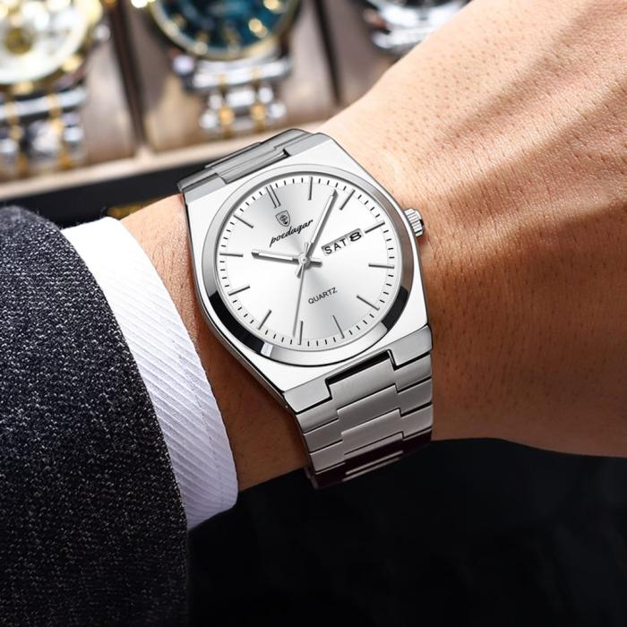 POEDAGAR 930 Men's New Luxury Luminous Date Week Stainless Steel Quartz Watch (White)